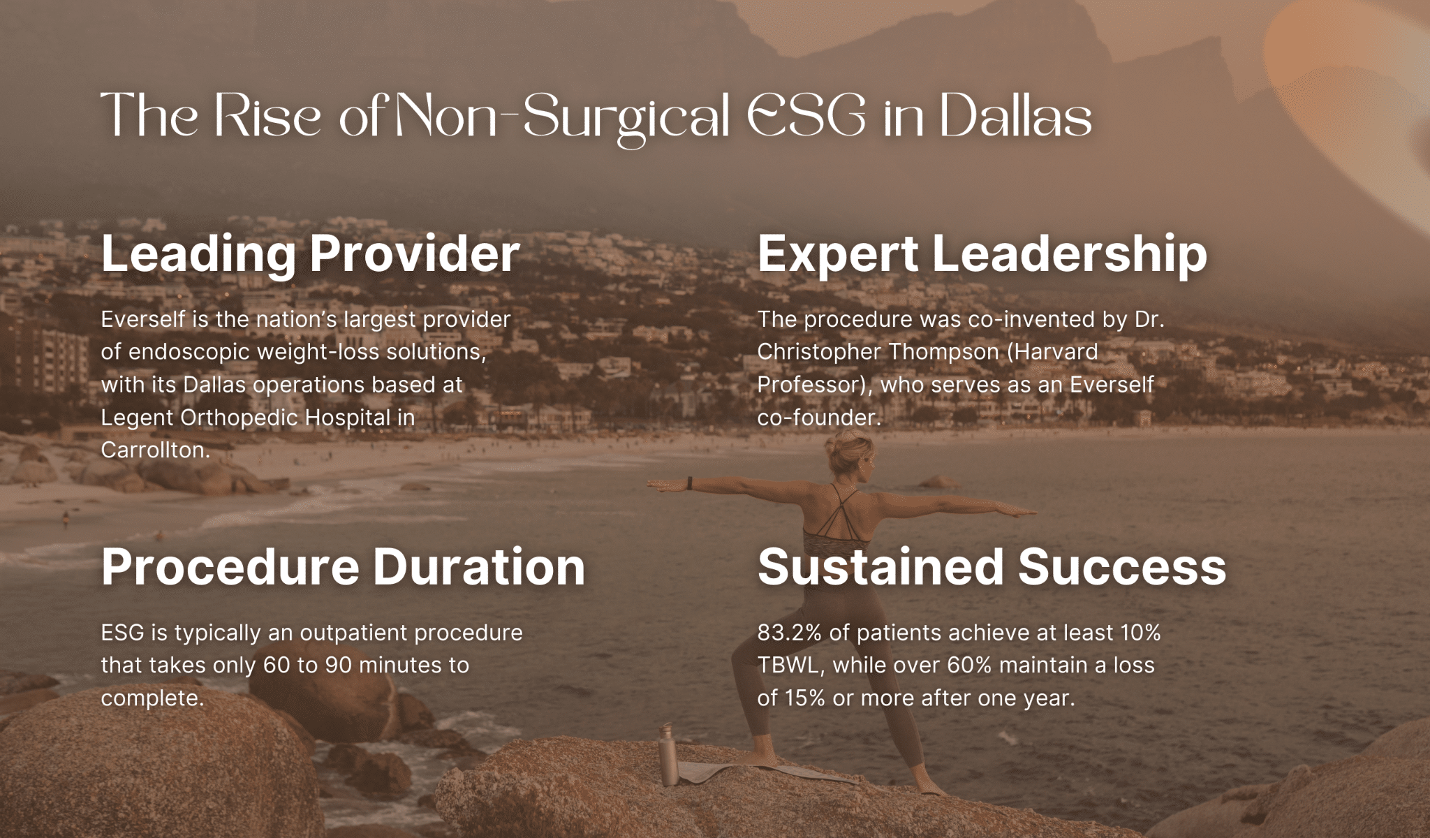 Everself’s model includes a 12-month longitudinal care programme that wraps around the ESG procedure. This encompasses registered dietitian support, nurse practitioner access, and where clinically appropriate, GLP-1 medication management. The framing is a long-term health partnership rather than a transactional procedure.