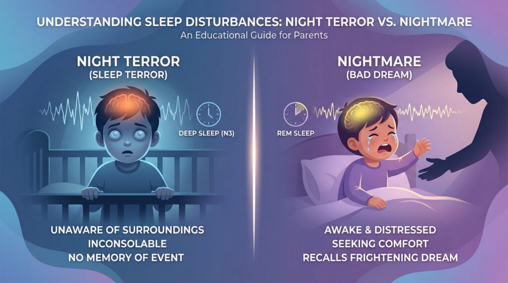 • Confusional arousals: a cousin of night terrors (partial waking from deep sleep) where kids may cry, be disoriented, and resist comfort, with little/no memory later [ICSD-3].