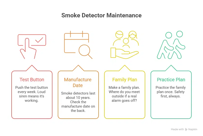 Push that test button every week. Loud siren? Perfect. No sound? Time for a new alarm. Smoke detectors last about 10 years. Check the manufacture date on the back. If it’s older, replace the whole unit.